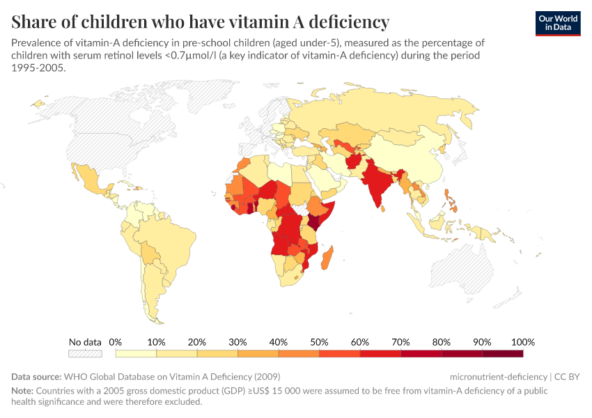 In the map, we see the prevalence of vitamin A deficiency in children under the age of 5, during the period from 1995 to 2005.