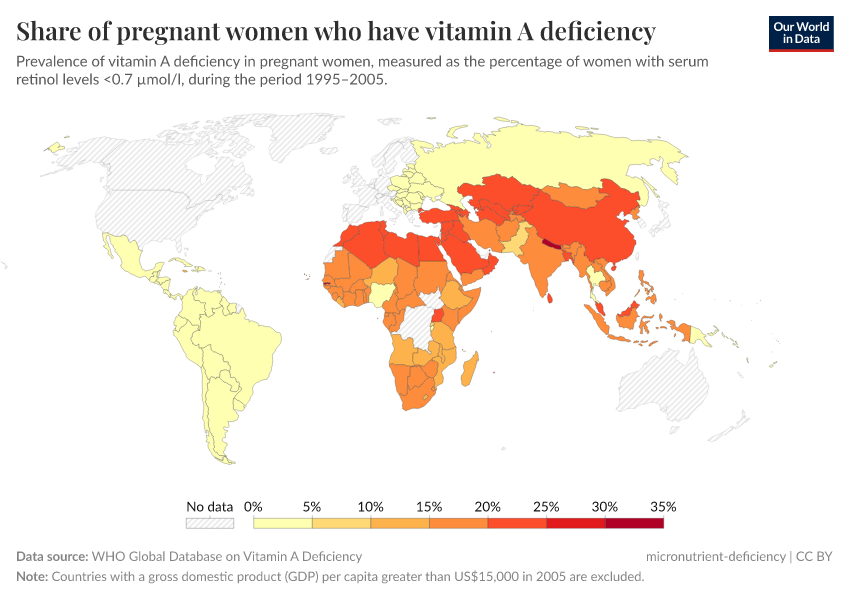 In the map, we see the prevalence of vitamin A deficiency in pregnant women, during the period from 1995 to 2005.