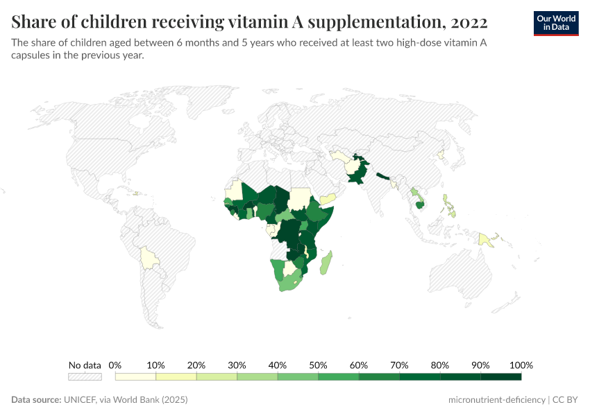 Vitamin A supplementation is relatively common in many countries in Africa and South Asia, although some countries still have low rates of supplementation.