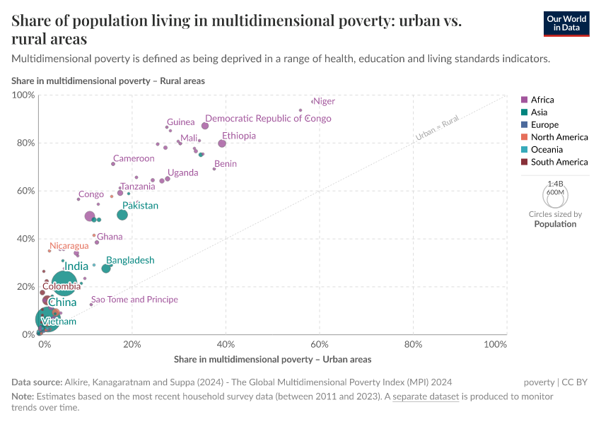 The chart shows that the share of people living in multidimensional poverty is higher in rural areas than in urban areas, but the extent of this gap varies considerably across countries.