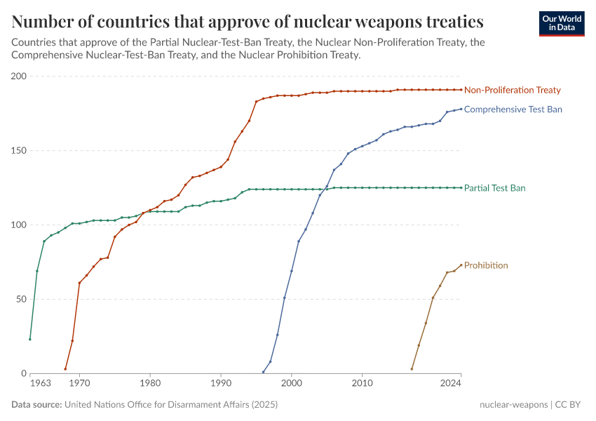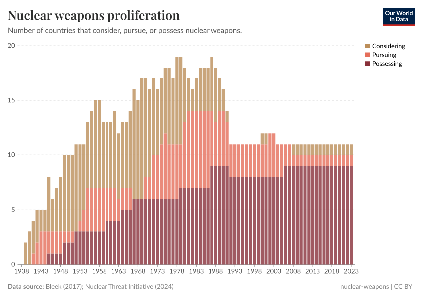 On this page, you can find writing, visualizations, and data on how many states have nuclear weapons, how many warheads they possess, how many oppose them, and how this has changed over time.