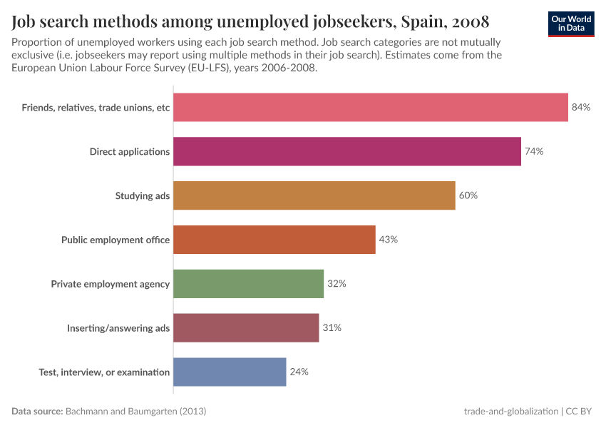 In Spain, 84% of the unemployed rely on contacts – friends, relatives, trade unions – to find a job. It is the most common job-search method. Direct applications and ads rank below, in places two and three.