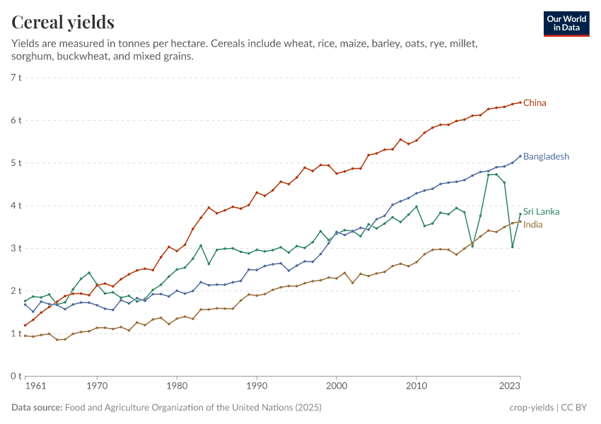 I’ve written previously about the benefits of agricultural technologies such as fertilizers, better seeds, pesticides, and irrigation for food production, poverty alleviation, and sparing natural habitat. These technologies have played a massive role in the dramatic rise in crop yields seen in countries like Sri Lanka, India, China, and Bangladesh. See the chart below.