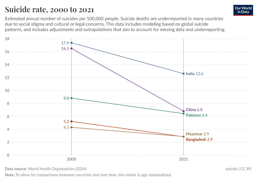 At the turn of the millennium, Sri Lanka had the second-highest suicide rate in the world (after Greenland). But look at the chart below: rates have fallen by almost two-thirds since then. Despite it having a growing population, the number of Sri Lankans dying from suicide has more than halved, saving thousands of lives every year.2
