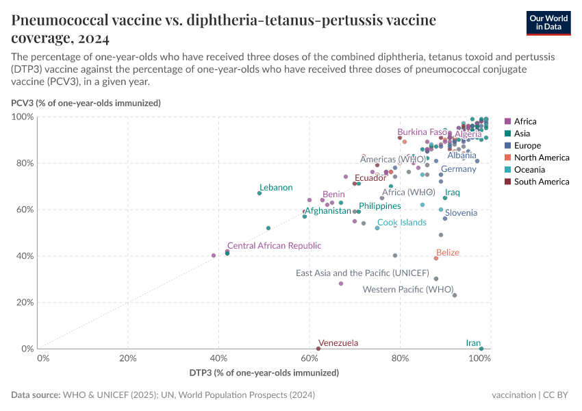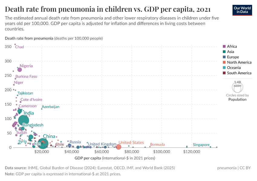 On this topic page, we look at who is suffering from pneumonia and why — and what can we do to reduce the number of people dying from this disease, with interventions such as vaccination, oxygen therapy, reducing air pollution, and more.