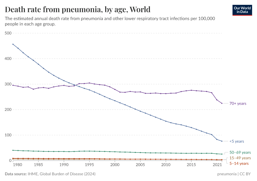 The chart shows the annual death rate from pneumonia per 100,000 people in different age groups.
