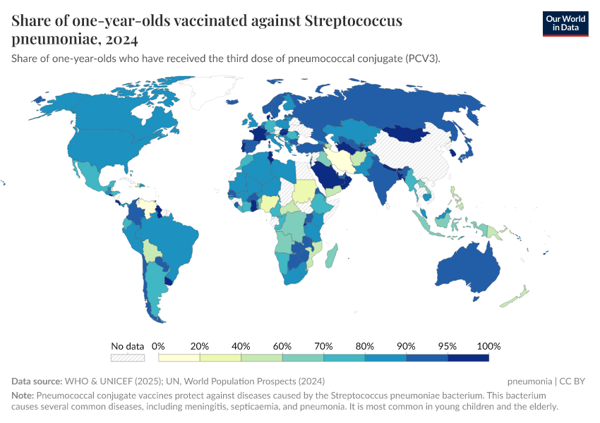 In 2021, around half of one-year-olds worldwide received the third dose of pneumococcal vaccines.