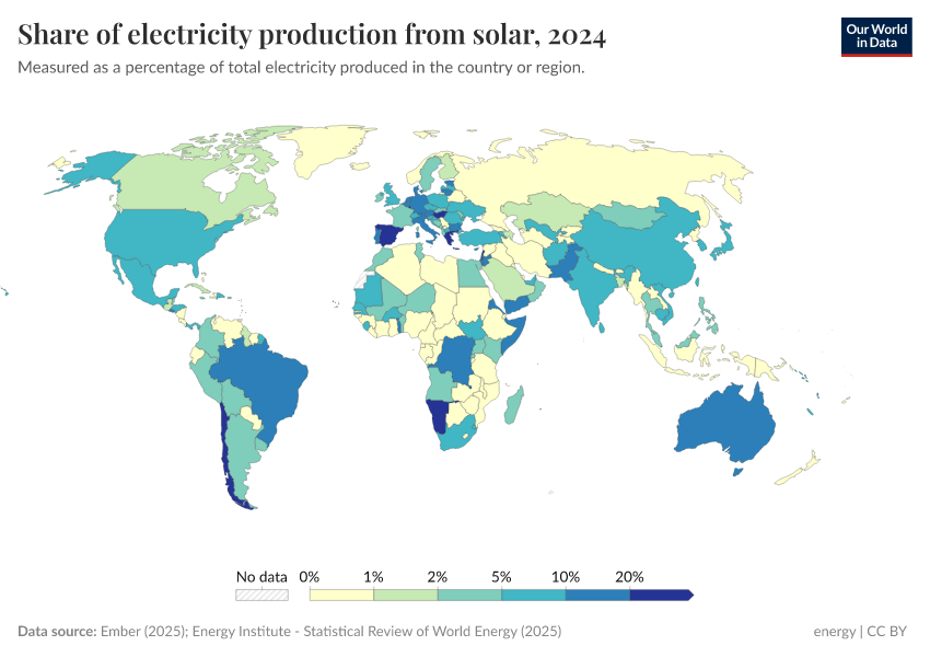 Energy generation is therefore a function of how much solar capacity is installed. This interactive chart shows installed solar capacity across the world.