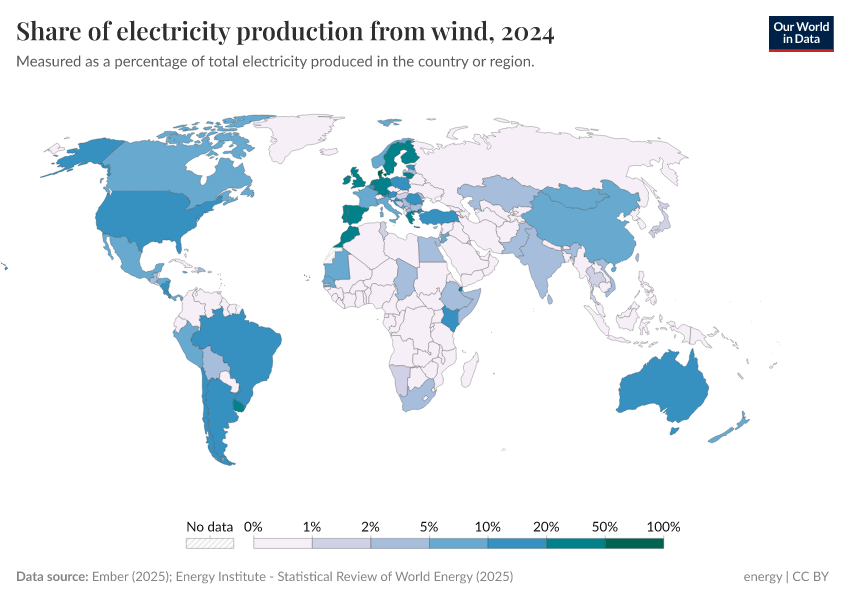 Energy generation is therefore a function of how much wind capacity is installed. This interactive chart shows installed wind capacity – including both onshore and offshore – across the world.