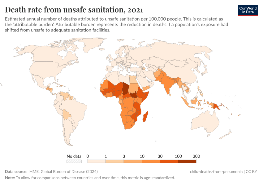 In this map, we see death rates from unsafe sanitation across the world. Death rates measure the number of deaths per 100,000 people in a given country or region.
