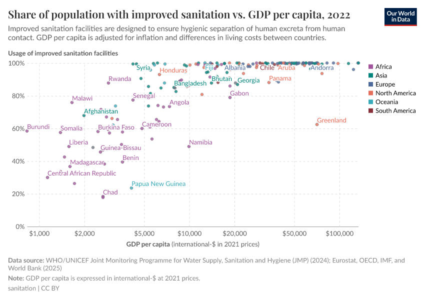 The provision of better sanitation facilities tends to increase with income. In the chart, we see the share of the population using improved sanitation versus gross domestic product (GDP) per capita.