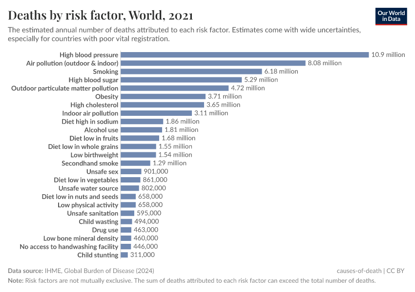 These estimates of the annual number of deaths attributed to a wide range of risk factors are shown here.