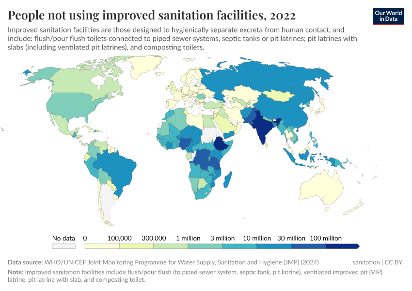 In the map shown, we see the number of people across the world who do not have access to improved sanitation.
