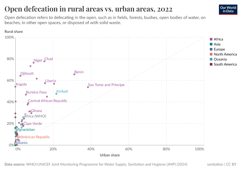 Although open defecation in urban areas is still a pressing issue in many countries, the problem is much more prevalent in rural areas.