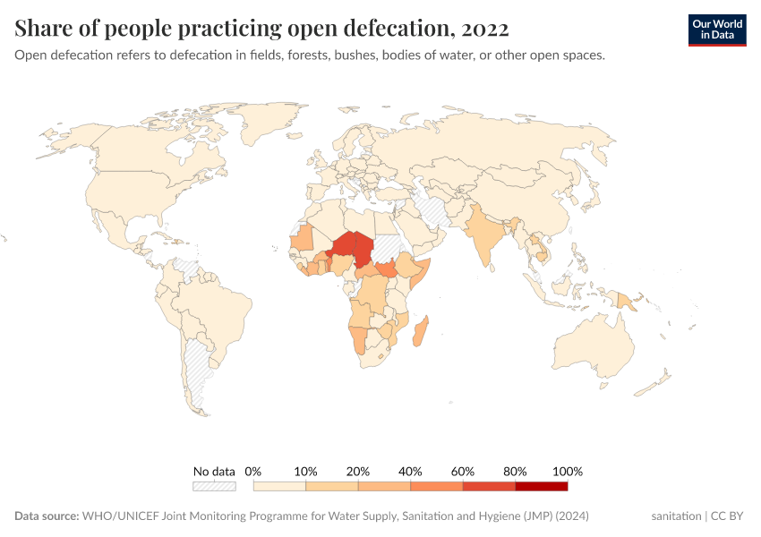 Open defecation: People practicing open defecation refers to the percentage of the population defecating in the open, such as in fields, forests, bushes, open bodies of water, on beaches, in other open spaces, or disposed of with solid waste.
