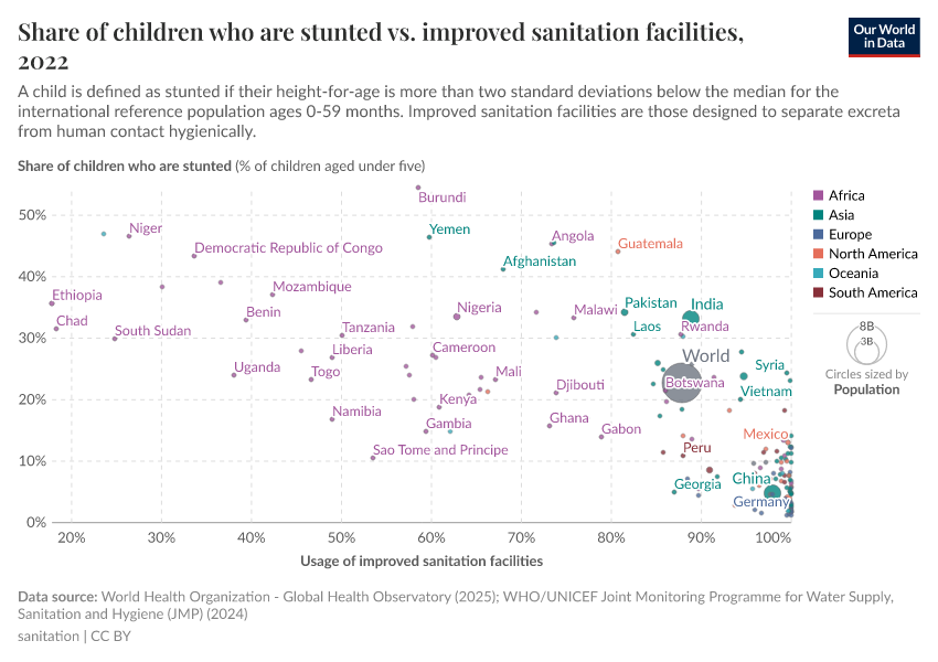 In the chart, we see the prevalence of stunting in children under five years old versus the share of the population using improved sanitation facilities. Overall, we see a negative correlation: rates of childhood stunting are typically higher in countries with lower usage of improved sanitation facilities.