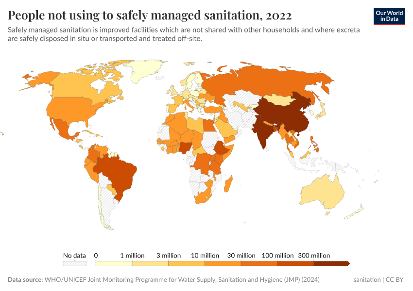 In the map shown, we see the number of people across the world who do not use safely managed sanitation.