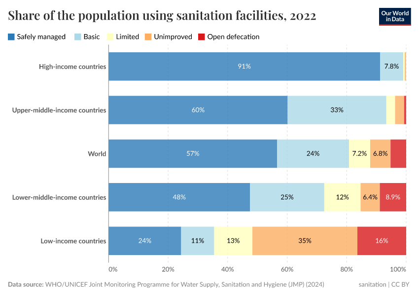 We see that in countries with the lowest incomes, only around one in five people use safe sanitation, much like safe drinking water; most live in Sub-Saharan Africa.