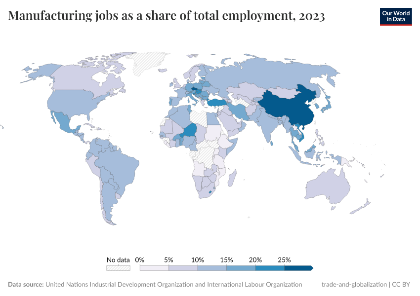This indicator measures the manufacturing sector's employment as a share of the country's total employment. Employment refers to all persons of working age who, during a specified brief period, were in paid employment (whether at work or with a job but not at work) or in self-employment (whether at work or with an enterprise but not at work).