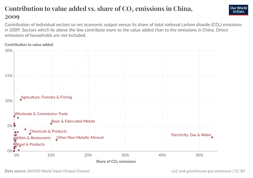 Even in China, the service sector has grown from contributing 24% to total economic output in 1995 to 33% in 2009, when most of the emissions “exported” from high to lower-income countries went to Chinese manufacturing. In the United States the service sector contribution has increased from 52% to 58% and in Germany from 50% to 55%. This growth in services has arisen mostly at the expense of heavy industry (which fell from 17.5% to 14.7% and 27% to 23%, in the USA and Germany, respectively), in addition to a fall in China's agricultural contribution. This is particularly notable in China, a country to which polluting industry has often been exported; the vast majority of all sectors have experienced much faster growth in economic output than in emissions. Thus, relative decoupling is a technical feasibility.
