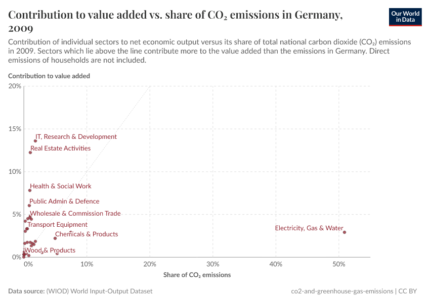 On the other hand, the charts in the previous section show that the sector that contributes by far the most emissions is energy and electricity generation. In Germany in 2009 it accounted for 51% of emissions and less than 3% of value added. Decarbonisation of the energy sector would thus contribute greatly to the decarbonisation of the economy without significantly affecting overall economic output, as a first approximation. Clearly, supply chains connect the growth and size of economic sectors. For instance, the digital economy requires a notable amount of electricity and material infrastructure. Yet, decarbonising the supplying sectors allows economic growth of the whole sectoral chain without a parallel growth in emissions.