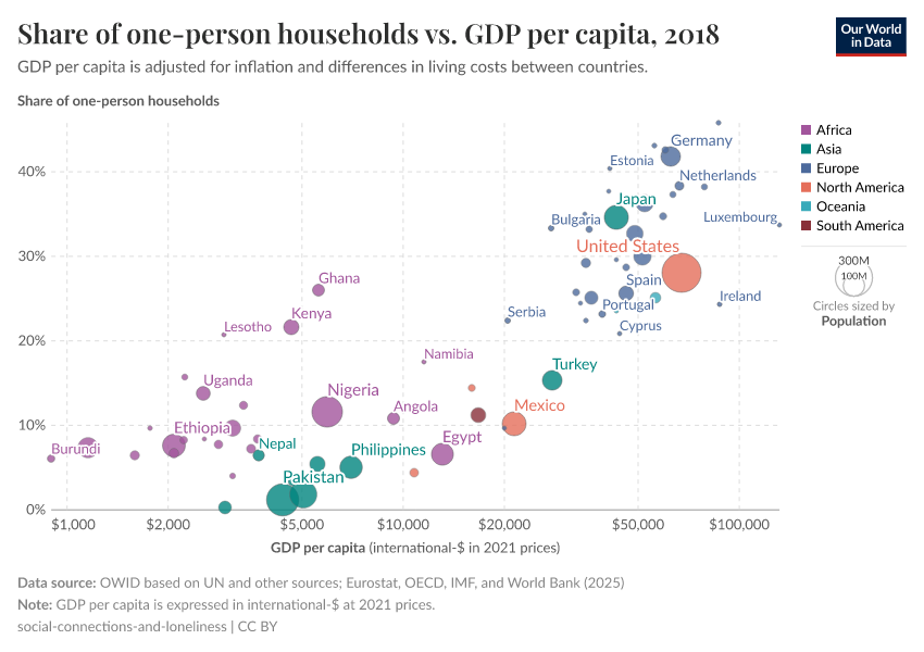 National income per capita and the share of one-person households are strongly correlated: As the chart here shows, people are more likely to live alone in rich countries.
