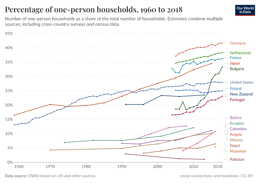 In the US, the share of adults who live alone nearly doubled over the last 50 years. This is not only happening in the US: single-person households have become increasingly common in many countries across the world, from Angola to Japan.