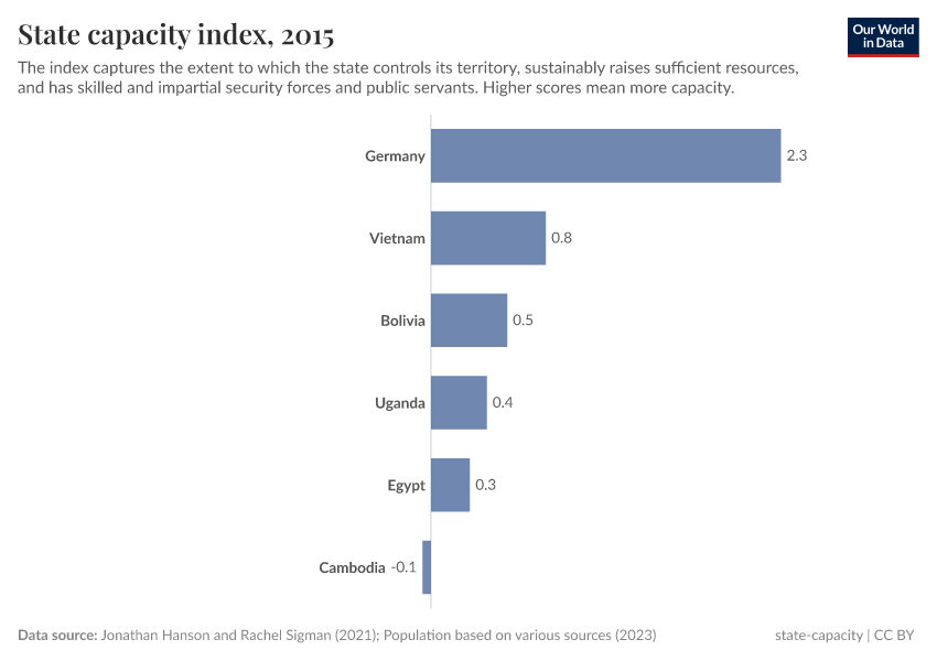 Understanding state capacity is crucial because it shapes a country's ability to address its many challenges. On this page, you can find related data and visualizations on how state capacity differs around the globe and how this has been changing over time.