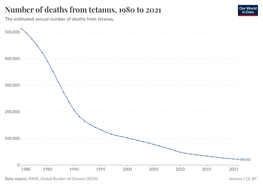 Over the past three decades, we have seen a significant fall in the estimated number of deaths from tetanus globally. You can see this in the chart. In the 1990s, it’s estimated that hundreds of thousands of people died from tetanus each year. In contrast, in the 2010s, that figure had declined to around 50,000 deaths annually.
