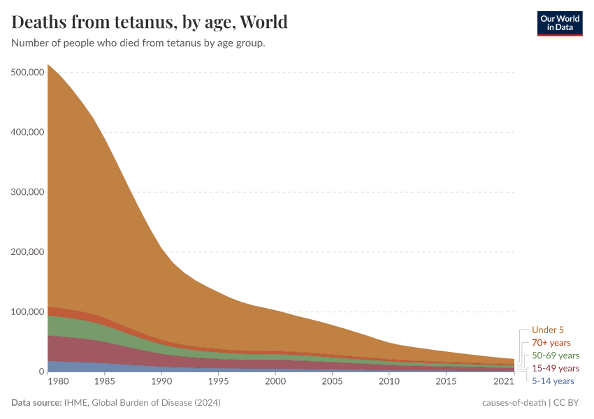 The chart also shows that the majority of tetanus deaths in the past and today occur in children under the age of 5.