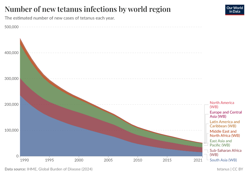 However, even though South Asia still sees more cases of tetanus than any other region, in just three decades the number of new infections has fallen massively, from close to 400,000 infections in 1990 to around 30,000 in 2019.