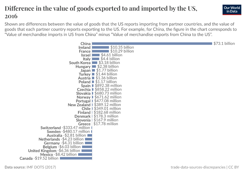 The chart here gives you an idea of how large import-export asymmetries are. Shown are the differences between the value of goods that each country reports exporting to the US, and the value of goods that the US reports importing from the same countries. For example, for China, the figure in the chart corresponds to the “Value of merchandise imports in the US from China” minus the “Value of merchandise exports from China to the US”.