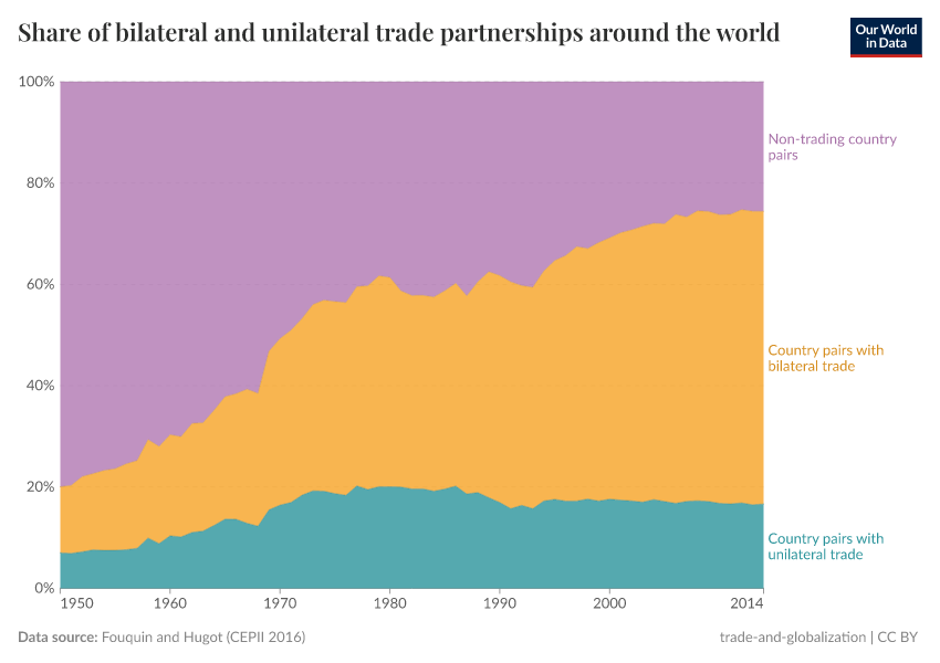 As we can see, bilateral trade is becoming increasingly common (the middle portion has grown substantially). However, many countries still do not trade with each other at all.