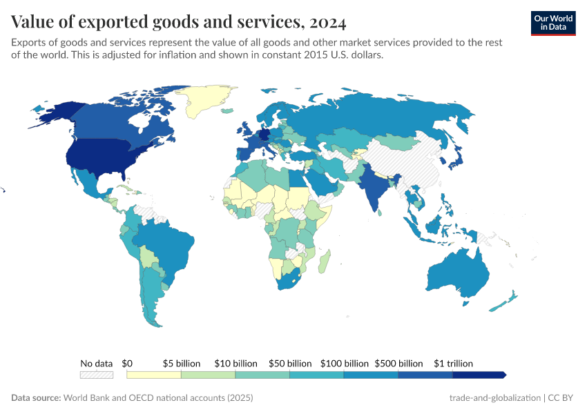 The chart shows the value of exports (goods plus services) in dollars, country by country.