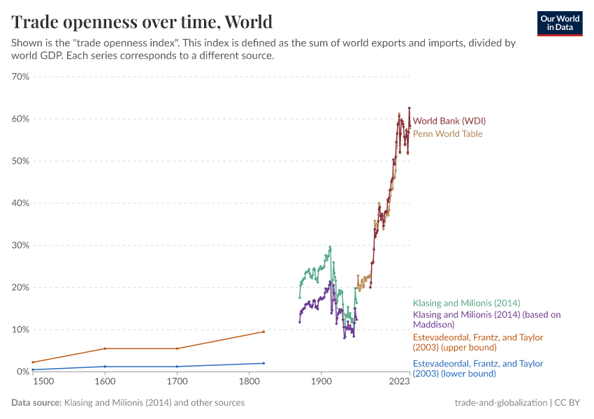 Esteban Ortiz-Ospina, Diana Beltekian, and Max Roser (2018) - “Trade and Globalization” Published online at OurWorldinData.org. Retrieved from: 'https://data-auxiliary-trade.owid.pages.dev/trade-and-globalization' [Online Resource]BibTeX citation
