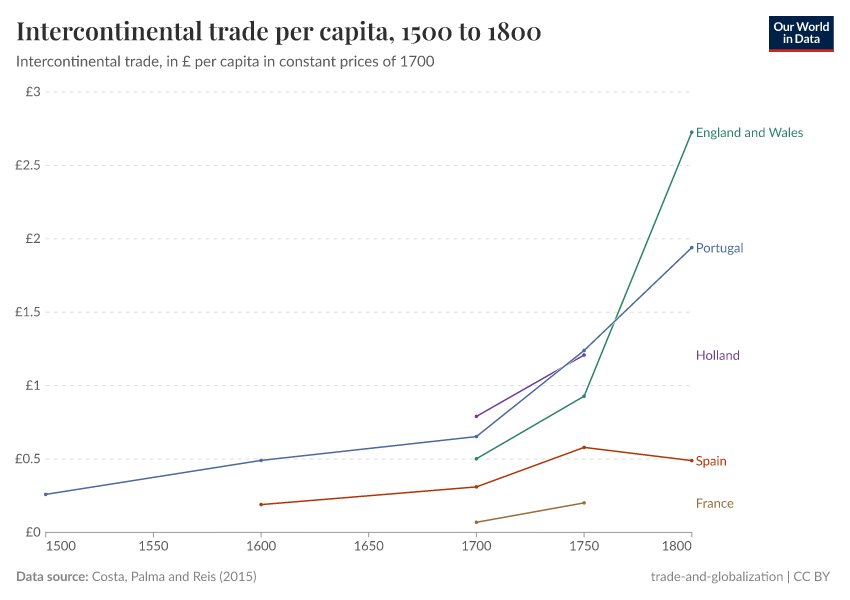 Over the early modern period, transoceanic flows of goods between empires and colonies accounted for an important part of international trade. The following visualizations provide a comparison of intercontinental trade, in per capita terms, for different countries.