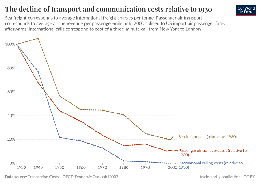 The worldwide expansion of trade after the Second World War was largely possible because of reductions in transaction costs stemming from technological advances, such as the development of commercial civil aviation, the improvement of productivity in the merchant marines, and the democratization of the telephone as the main mode of communication. The visualization shows how, at the global level, costs across these three variables have been going down since 1930.