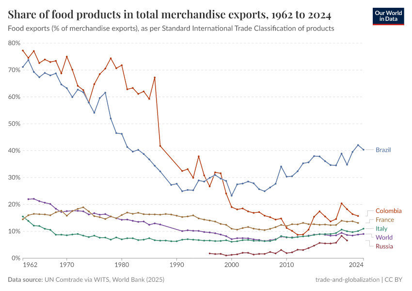 The next visualization plots the share of food exports in each country's total exported merchandise. These figures, produced by the World Bank, correspond to the Standard International Trade Classification, in which 'food' includes, among other goods, live animals, beverages, tobacco, coffee, oils, and fats.