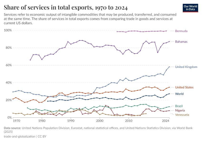 In some countries services are today an important driver of trade: in the UK services account for around half of all exports; and in the Bahamas, almost all exports are services.
