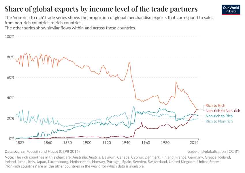 As we can see, up until the Second World War, the majority of trade transactions involved exchanges between this small group of rich countries. But this has changed quickly over the last couple of decades, and today, trade between non-rich countries is just as important as trade between rich countries.