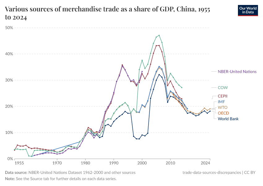 So, if all series are in the same units (share of national GDP) and they measure the same thing (value of goods exported from one country to the rest of the world), what explains the differences?