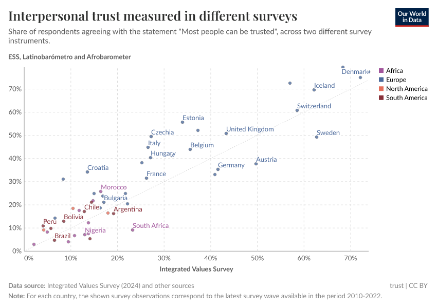 One of the most widely used tools to measure trust attitudes across the world comes from the World Values Survey – an international research project that has been conducting standardized nationally-representative social surveys enquiring about political, socioeconomic, and cultural values of people around the world for decades.