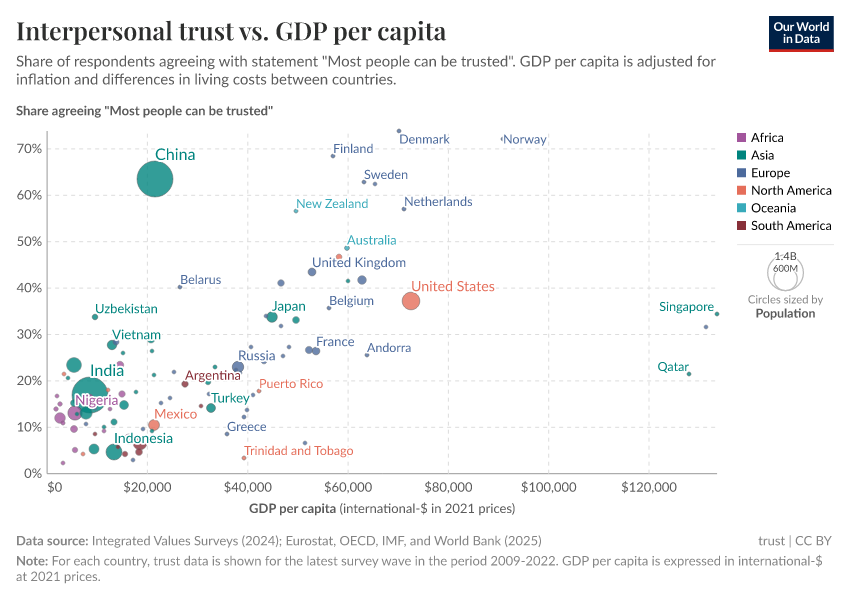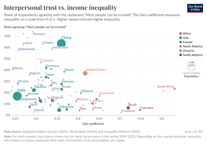 Each dot on this scatter-plot corresponds to a different country, with colors representing different world regions and dot sizes representing the size of the population. A Gini index of 0 would represent perfect equality, so the observed negative correlation in this graph shows that higher inequality is associated with lower trust.