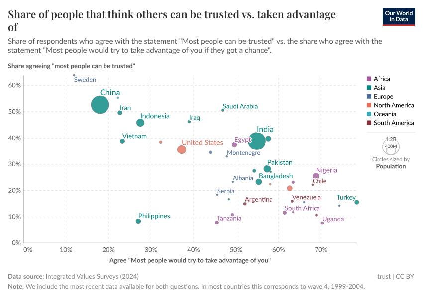 Consider Peru again as an example. You find it in the bottom right corner of the chart. A significant share of Peruvians report thinking that others they interact with would try to take advantage of them if given the chance. Correspondingly, only a small fraction of people in the country report believing that others can be trusted.