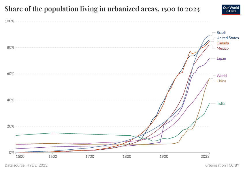 In the map below we see how the share of populations living in urban areas has changed in recent centuries. Data on urbanization dating back to 1500 is available only for select countries, with an estimated share at the global level. Using the timeline on the map (or by clicking on a country) you can see how this share has changed over time.