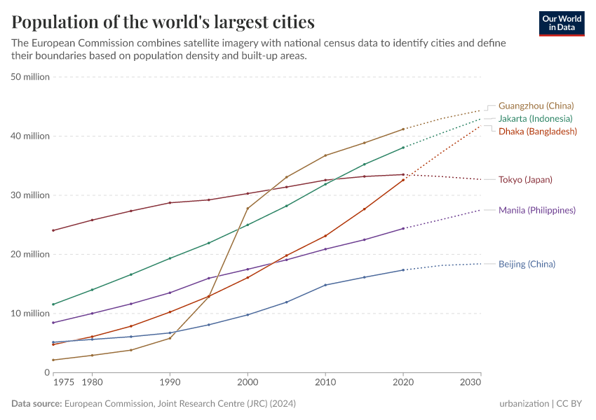 According to the European Commission, Guangzhou — a city in China — was the most populous city in the world, with over 40 million inhabitants. Back in 1975, its population was just over 2 million. Dhaka (the capital of Bangladesh) increased from less than 5 million in 1975 to over 33 million in 2020 (and is projected to reach more than 40 million by 2035).