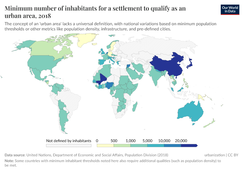 There is currently no universal definition of what 'urban' means. The UN reports figures based on nationally defined urban shares. The problem, however, is that countries adopt very different definitions of urbanization. Not only do the thresholds of urban versus rural vary, but the types of metrics used also differ. Some countries use minimum population thresholds, others use population density, infrastructure development, employment type, or simply the population of pre-defined cities.