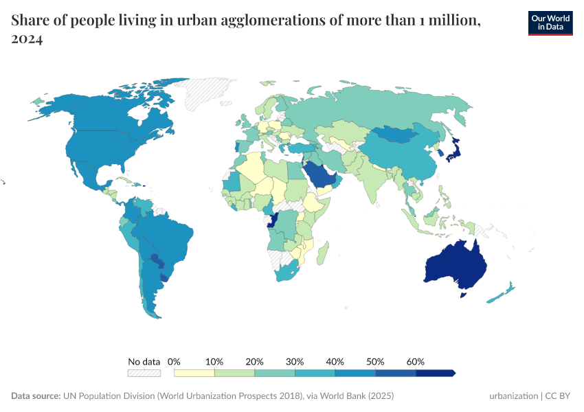 Although the definition of 'urban' gives us some indication of population densities, it does not differentiate between those who live in small versus large urban settings. In the chart, we show the percentage of the total population that lives in agglomerations greater than one million people (i.e. large urban agglomerations). These figures are available in absolute terms (the total number of people living in large urban settings), found here.