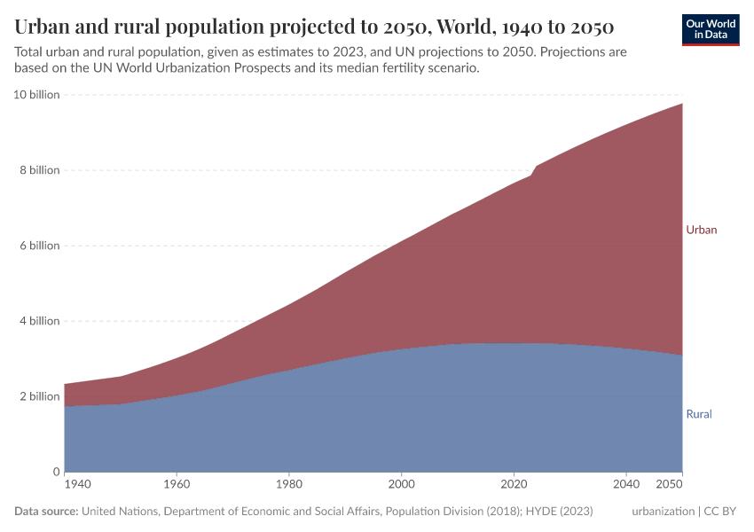In the chart, we see estimates of urban and rural populations in absolute terms, projected through to 2050. Projected population growth based on the UN's medium fertility scenario. By 2050, the global population is projected to increase to around 9.8 billion. It's estimated that more than twice as many people in the world will be living in urban than in rural settings.