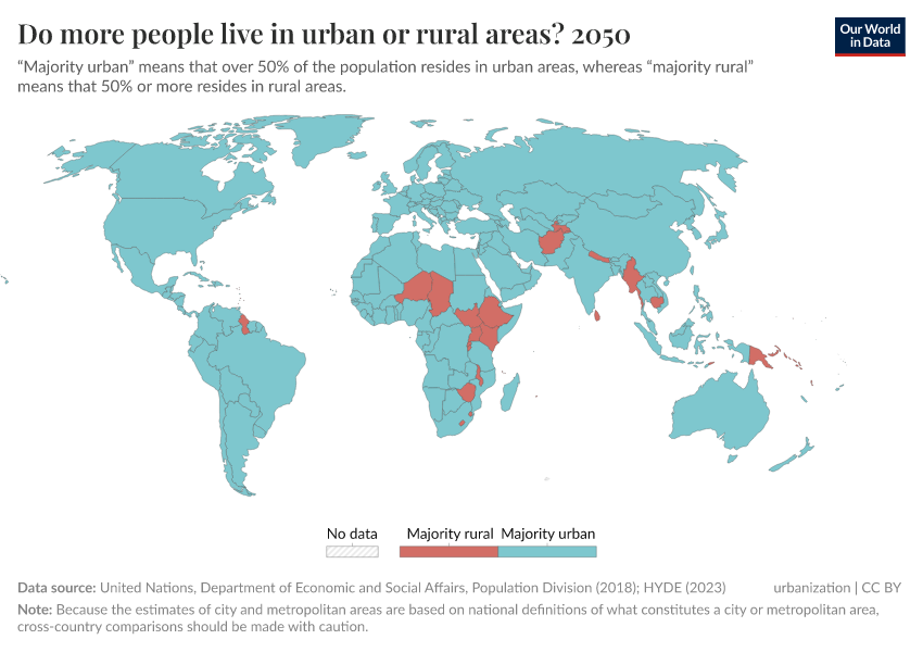 Using our timeline map of urbanization you can explore how countries are expected to transition from predominantly rural to urban in the coming decades. There we see that by 2050 it's projected that the majority of countries will have a majority (greater than 50%) of people living in urban areas.